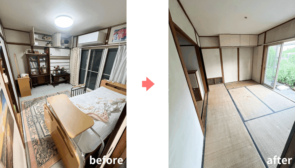 お部屋の中には、長年の暮らしの中で大切にされていた思い出の品々が多く残されており、一つひとつ丁寧に仕分けしながら、必要なもの・残したいもの・処分するものを明確にしていきました。